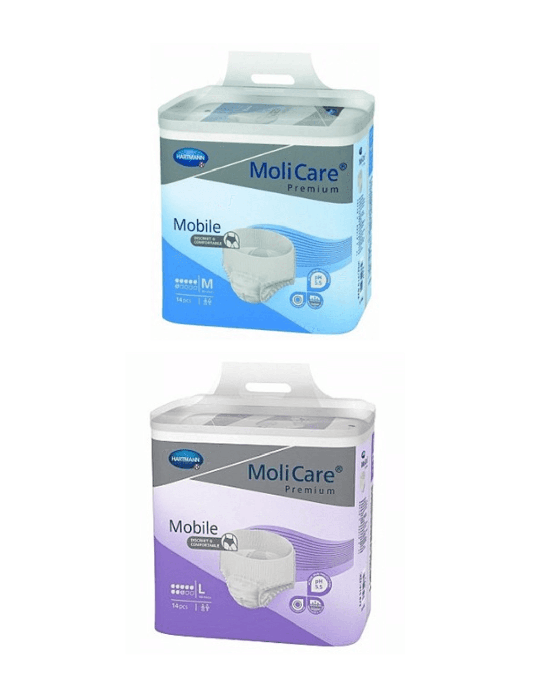 MoliCare Premium Mobile pull up pants look and feel like normal underwear and offer the highest level of leakage protection. The three way protection system gives MoliCare Mobile extra-strong leakage protection. The unique DryPlus non-woven layer locks liquid away rapidly to keep the skin comfortably dry.